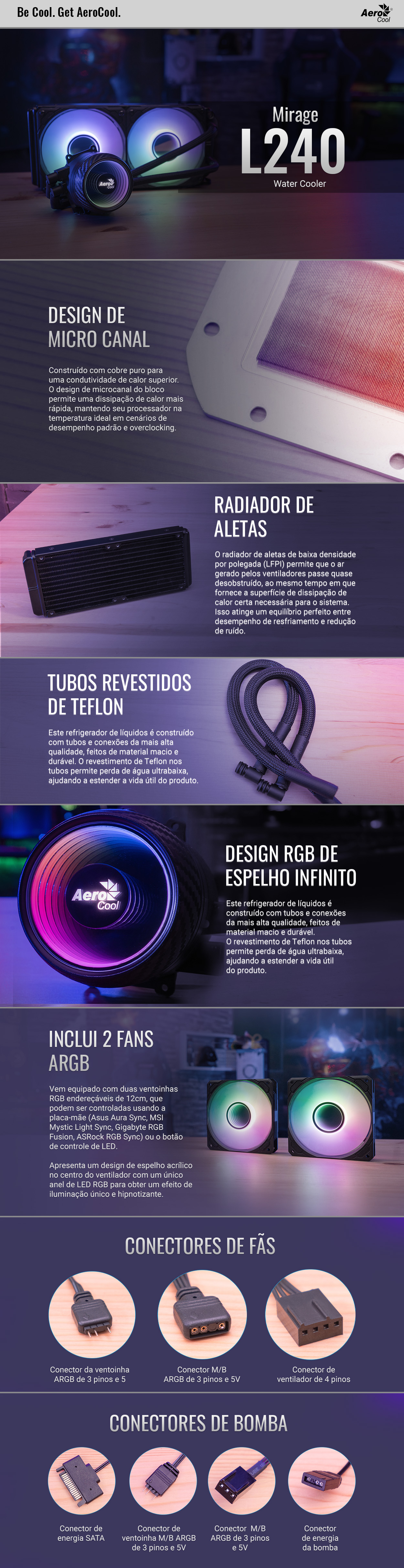 Já o revestimento de Teflon na tubulação minimiza a perda de água, prolongando a vida útil do produto e garantindo a máxima eficiência por muito mais tempo. Com o Water Cooler Aerocool Mirage L240, você terá uma máquina muito mais potente no seu setup!